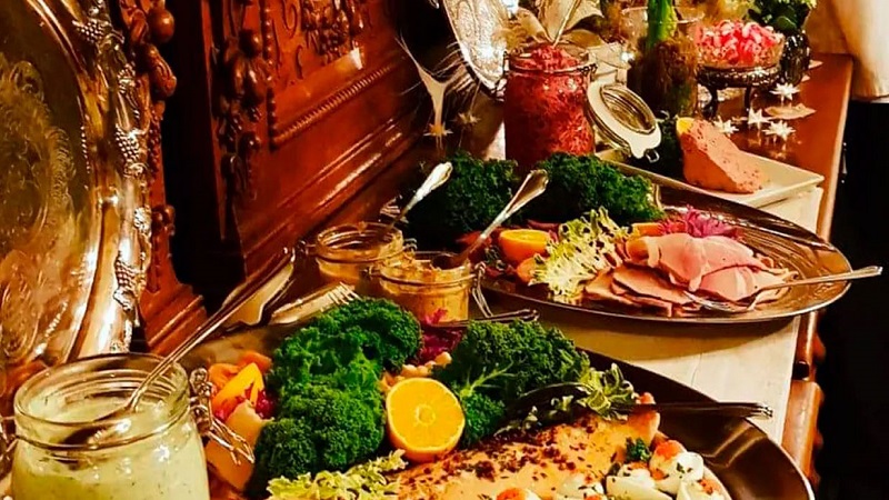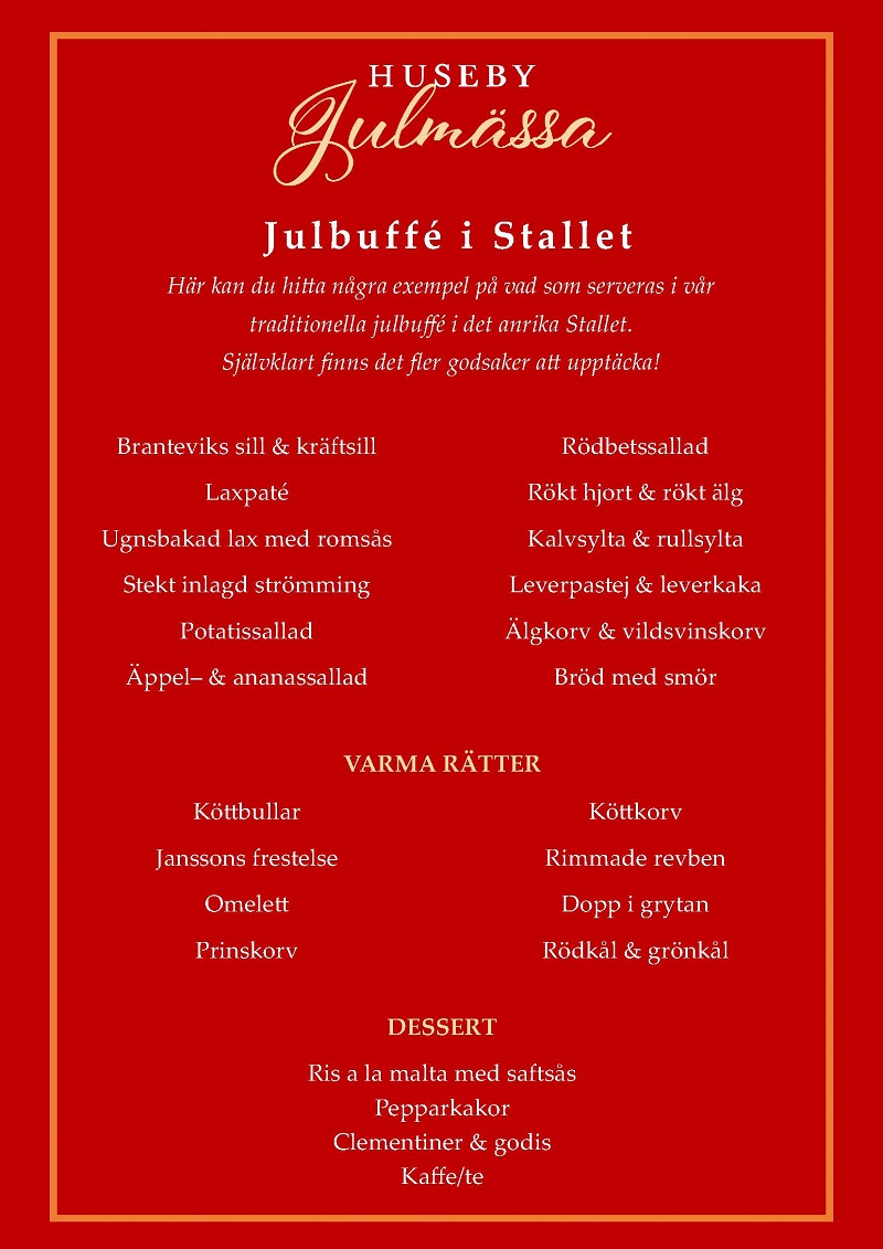 Vid ankomst till Huseby serverar Stallet det bästa från det klassiska småländska julbordet, precis som på Frökens tid. Här hittar du sillar och stekt strömming, laxar och syltor, korvar och rökt kött, omeletter, prinskorvar och köttbullar. Naturligtvis bjuds det på dopp i grytan, gammaldags leverpudding och långkål på grönkål från brukets egen köks-trädgård. Avsluta med ris à la Malta, saftsås, clementiner och godis. All den goda maten är hemlagad med fina småländska råvaror.